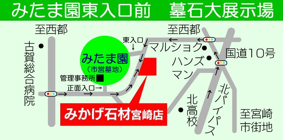 北バイパス・佐土原・西都方面よりみたま園へ向けてお越しの方は最初の一軒目の墓石展示場・工場です。